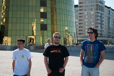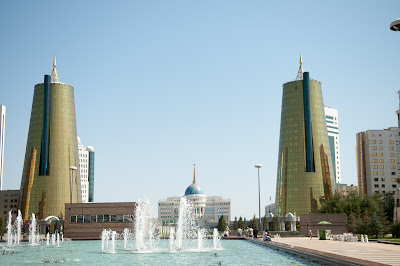 The next day we finally reached Astana, in time to have lunch (at a Bavarian theme restaurant!) with Alex and his friend Aidos Kapanov. They also gave us a fascinating tourist tour of this newly built capital of Kazakhstan, which has a lot of the insanity of Ashgabat in it (marble palaces, fountains, flagpoles, etc.), but also contains real people and life. Quite an experience.