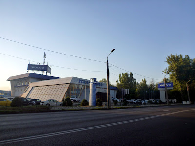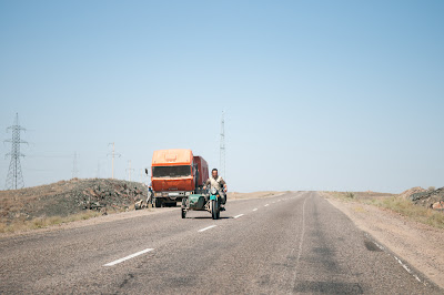 Road quality was actually quite good, and became better closer to the capital. But keeping high speed on this road did require a lot of concentration and the distance was murderously long. For most of the drive, there was absolutely nothing to see on either side of the road. Early in the evening, we reached the city of Karaganda, in Soviet times the preferred city used to signify in the middle of nowhere in Russian and the punchline of a popular joke built on this (“Где?” — “В Караганде!”). Here we made what was supposed to be a quick stop for dinner, but after stuffing ourselves with shashlik we came back to a car that wouldn’t start.