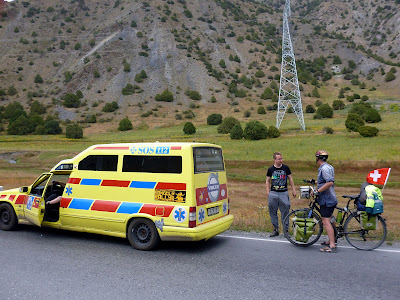 After that, I sat leisurely in the patient-care compartment of the ambulance, glancing out at the rising mountains around us, writing a blog post about our experiences in Turkmenistan. Shortly before I saw the first snow-capped mountain top, the good paved road ended abruptly and the way across the Shakristan Pass (3,378 m above sea level) continued as a dirt track.