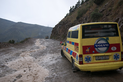 Our climb up the mountain came to an abrupt halt when Thomas drove the ambulance straight onto a rock. The shock of the impact and the resulting full stop was scary enough, but rushing out of the vehicle to see unidentified liquid on the ground and dripping from somewhere in the engine compartment was even scarier. Thomas managed to reverse the ambulance back a little bit from the rock so that we could take a closer look at both it and at the underside of the car. On the uneven ground it was neigh impossible to see anything useful under the car and the fine dirt dust had effectively sucked up everything that had leaked out to make it unidentifiable.