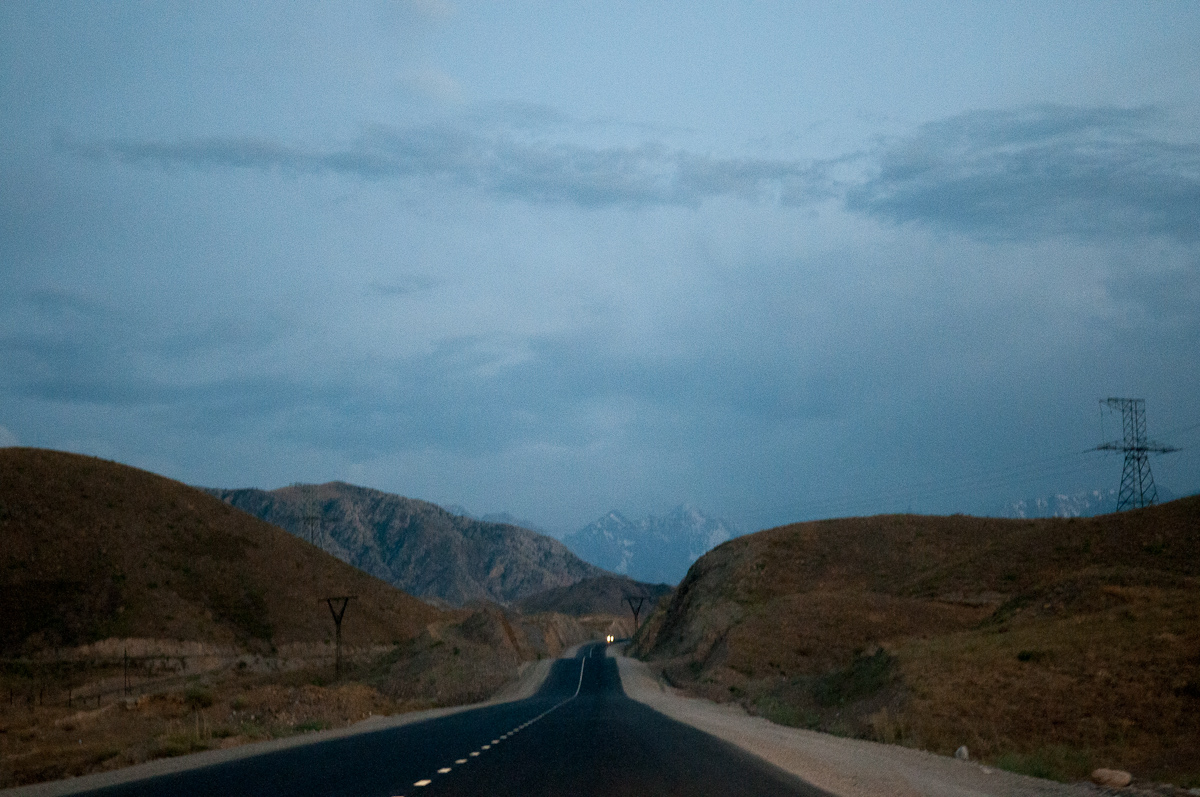 Our hopes of arriving in Osh at a reasonable time grew the longer we drove on this highway, but were eventually crushed at the police checkpoint before yet another enclave. To not enter the enclave, we were directed to a “road” that we could never have believed to be the correct one unless four different people had independently of each other insisted on it. It was a dirt track of Shakristan Pass quality, passing through some kind of wasteland along the Uzbekistan border, with almost no traffic and by this time in complete darkness.