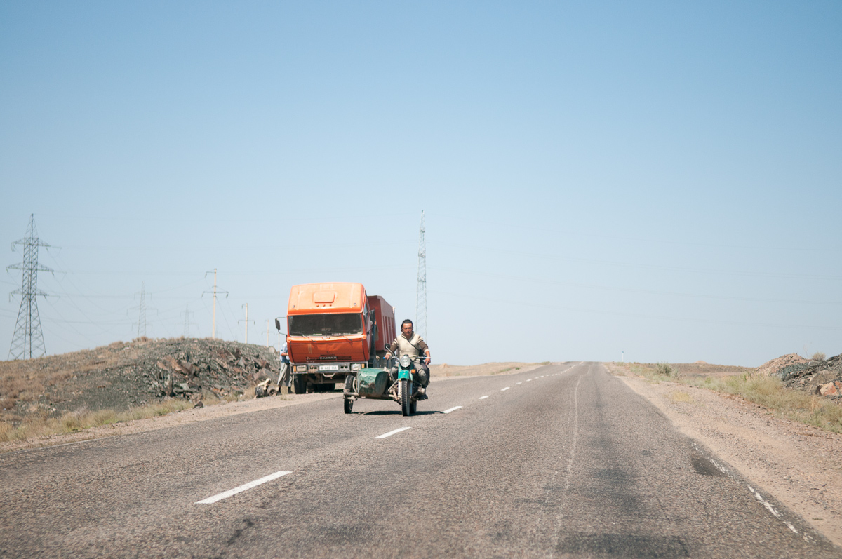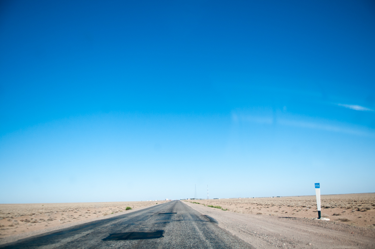 The next destination on our journey was to be the Kazakh capital of Astana, connected to Almaty by a 1,200 km road across vast expanses of emptiness. Accounts differed on the quality of this road and on whether it would be realistic to drive all the way in one day. The most optimistic claimed that it was possible to drive the entire distance in 10 hours in a good car, and the most pessimistic claimed that it wasn’t possible at all. So we left Nikita’s apartment early in the morning to find out for ourselves how far it would be possible to drive and have ample time to find a suitable place to stay the night if the drive turned out to be too long.