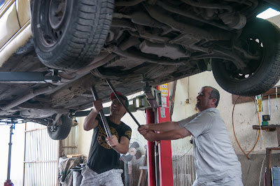 With the help of his two sons (his apprentices), he lifted up the car in the workshop and with the oldest son using the small and the huge sledgehammer bent everything, that had been damaged under the car, into shape again so that he could dismantle the transmission. The fluid that had leaked out upon impact (which had the colour of motor oil, but not really the right thickness for actually being motor oil) had been automatic transmission fluid. It just has a very different colour when it comes out than what it has when it goes in, which now became obvious when Rustan emptied all the old fluid from the transmission system. Then Abdul drove me to the mechanics’ bazaar to buy some litres of new automatic transmission fluid, and Abdul (of course) knowing exactly where to go, we found authentic Toyota automatic transmission fluid, imported from Japan, while Rico stayed in the workshop in case there were any questions to be answered and to take some photos.